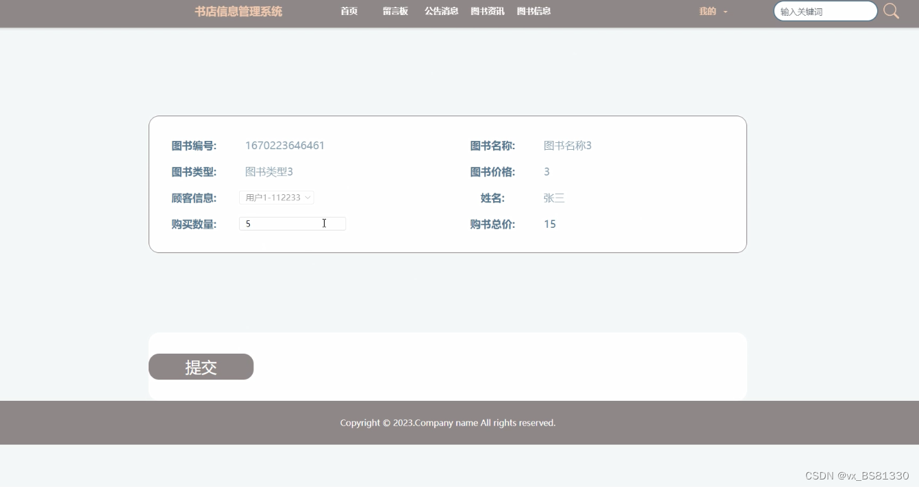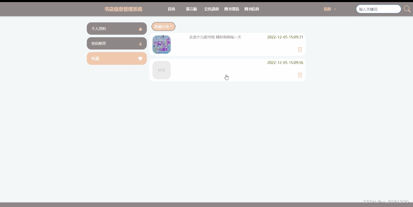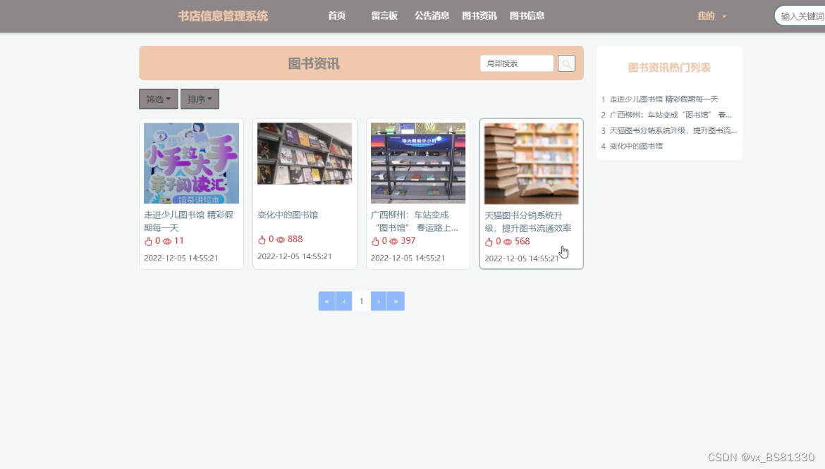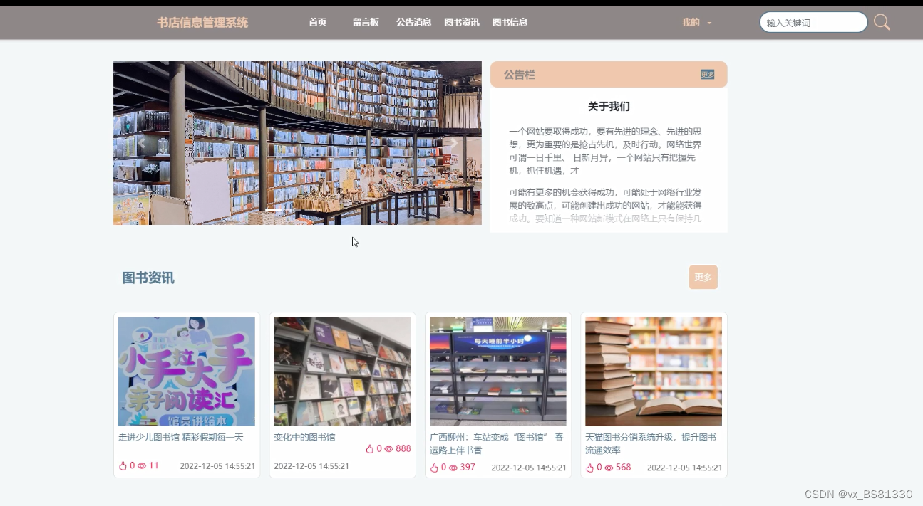The bookstore information management system adopts technologies such as B/S structure, Java development language, and MySQL database. The system is mainly divided into two parts: administrator and user. The main functions of administrator management include: homepage, rotation chart, bulletin board, resource management (book information, information classification) communication management (message board, message board classification) system user (administrator, customer user) module management (book information, classification management, purchase information, storage records, purchase records), etc. The user's personal front desk management mainly includes functions such as homepage, message board, announcement message, book information, and book information, basically realizing the entire process of information management in the bookstore information management system. This system adds the function of pushing the latest information on the homepage to facilitate users to quickly browse, and is an efficient, dynamic, and interactive bookstore information management system.