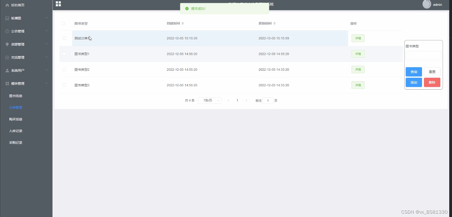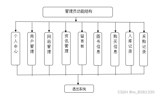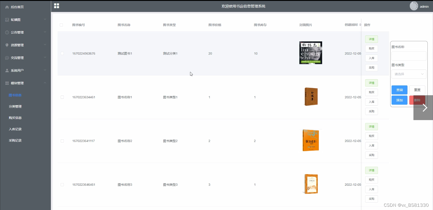 管理员功能模块包括:首页、轮播图、公告栏、资源管理(图书资讯、资讯分类)交流管理(留言板、留言板分类)系统用户(管理员、顾客用户)模块管理(图书信息、分类管理、购买信息、入库记录、采购记录)等模块。