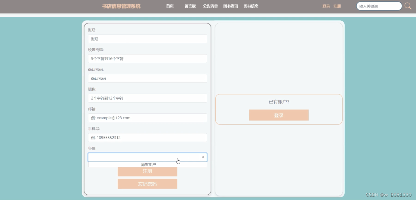 用户功能模块用户模块包括:首页、留言板、公告消息、图书资讯、图书信息等模块。