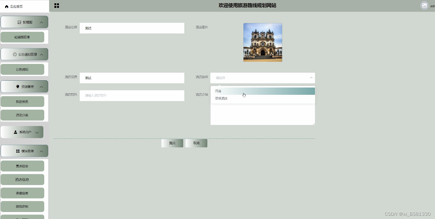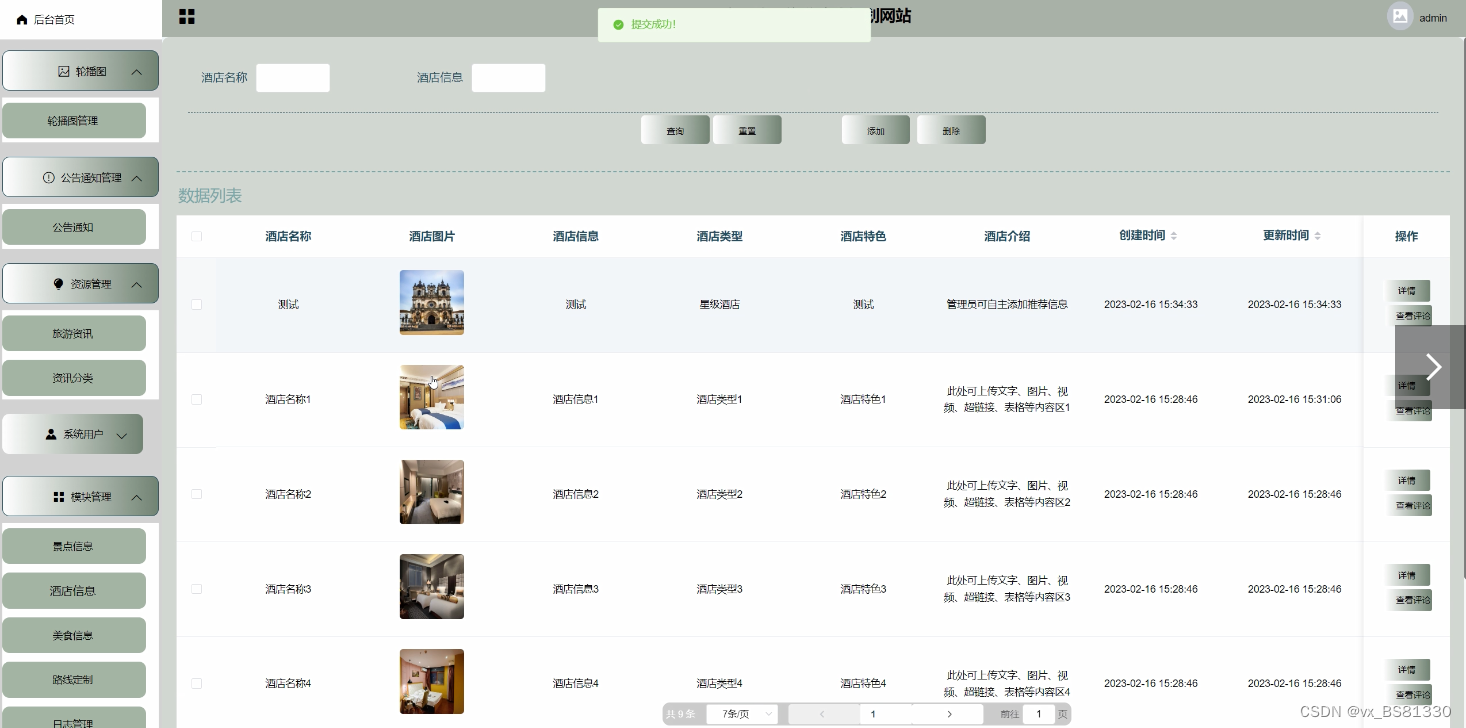 酒店信息:根据业务需要,管理员对酒店信息里的信息增删改查等操作。