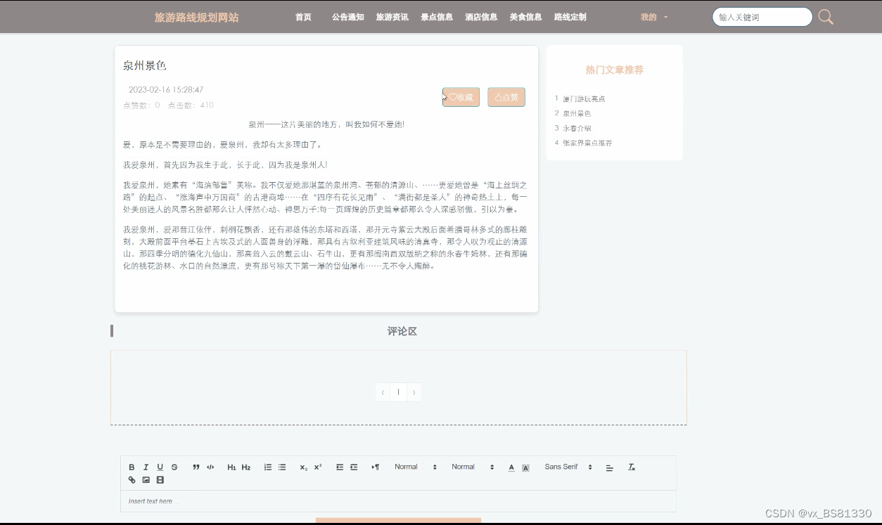 景点信息模块:从管理员发布的景点信息中选择要查询的景点,并可以进行景点信息进行点赞、收藏。
