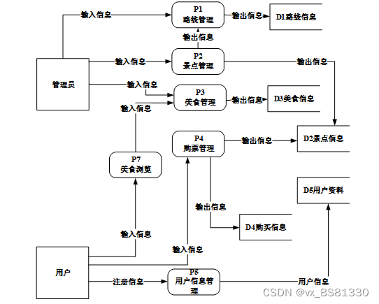 根据系统的业务流程,用户浏览所使用到的数据归纳为输出信息。而用户提交的数据则作为系统的输入数据。相应的,根据系统管理员业务流程,管理员对系统内容的添加、更新和删除等所操作的数据定义为输入信息。