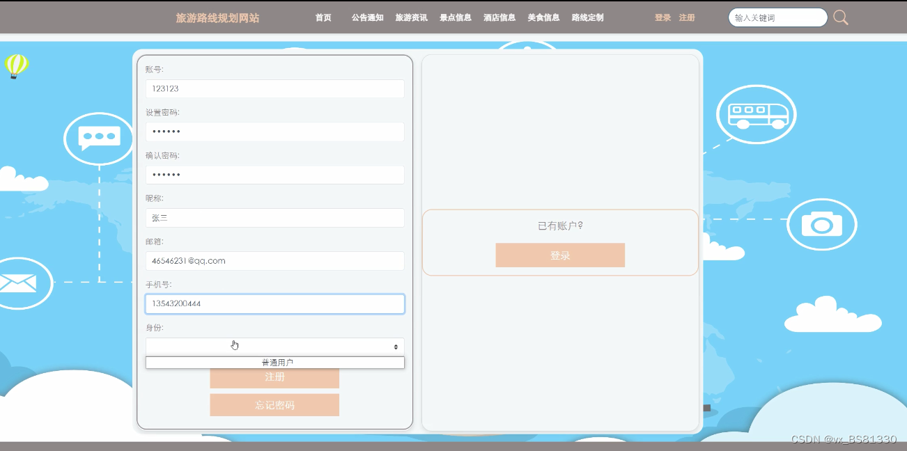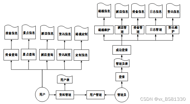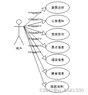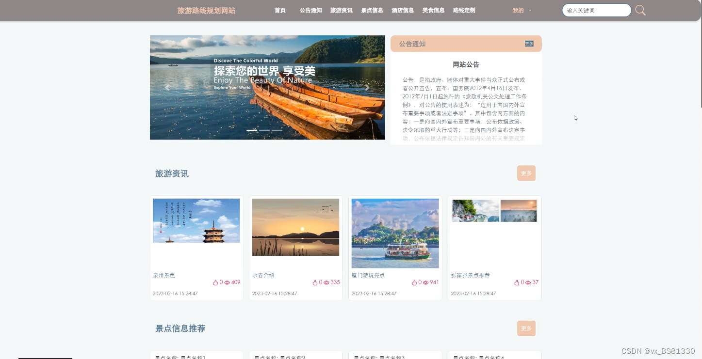 该系统实现了旅游路线规划管理的各种工作流程计算机管理化,其中包括首页、轮播图、公告通知、资源管理(旅游资讯、资讯分类)系统用户(管理员、注册用户)景点信息、酒店信息、美食信息、路线定制、日志管理等功能。
