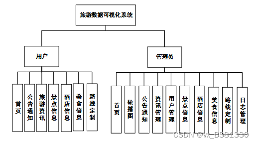 根据对系统的功能进行分析可以总结响应式旅游资讯网站的具体功能模块包括下面的几个主要的功能模块:该系统主要从两大模块进行设计的,首先就是用户参与操作需要的模块,此外还需要有管理员用到的模块,两者之间不是互相独立的,他们之间有着密切的联系,同数据库表中的数据连接起来进行操作。每个模块访问相同的数据库,但访问的表不同。系统的各个功能模块是根据所收集的资料研究得到的。在以上分析功能的基础上,系统模块分为多个模块。用户含有的功能有首页、公告通知、旅游资讯、景点信息、酒店信息、美食信息、路线定制等功能,管理员含有的功能有首页、轮播图、公告通知、资源管理(旅游资讯、资讯分类)系统用户(管理员、注册用户)景点信息、酒店信息、美食信息、路线定制、日志管理管理等功能。