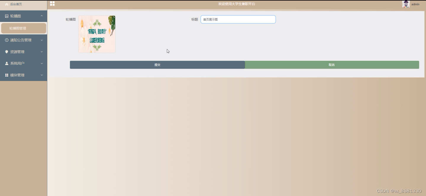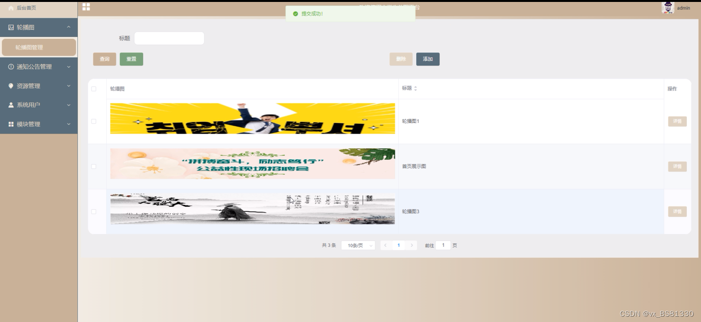 轮播图管理:管理员在这一栏可以编辑标题+图片等详细描述信息进行发布、删除、添加等操作,如图5-5 5-6所示。