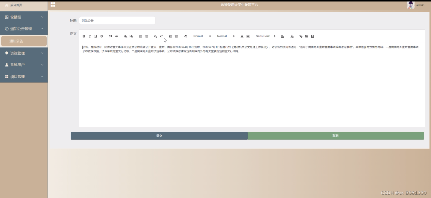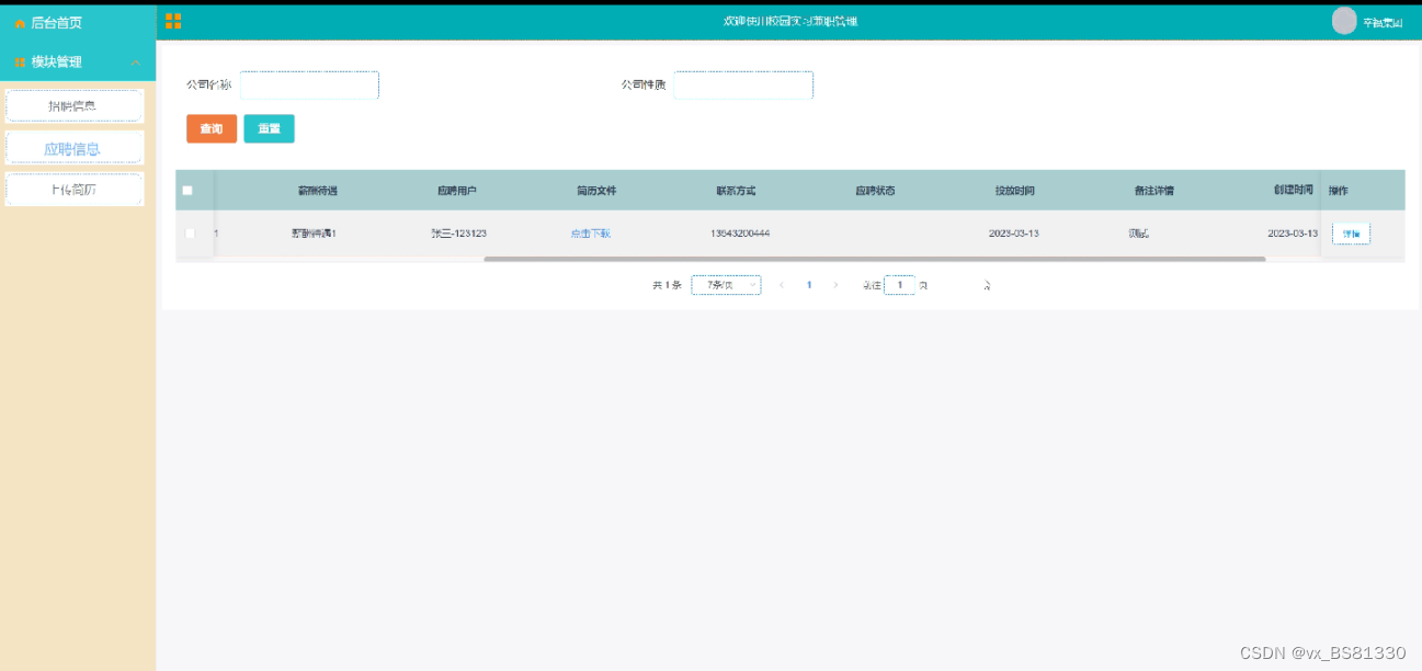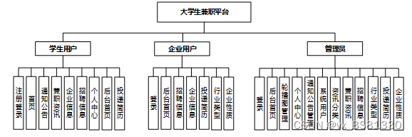 (1)功能要求:后台首页、个人中心、轮播图管理、通知公告管理、资源管理(兼职资讯、资讯分类)、系统用户(管理员、学生用户、企业用户)、模块管理(企业信息、招聘信息、企业性质、投递简历、行业类型)等功能模块。