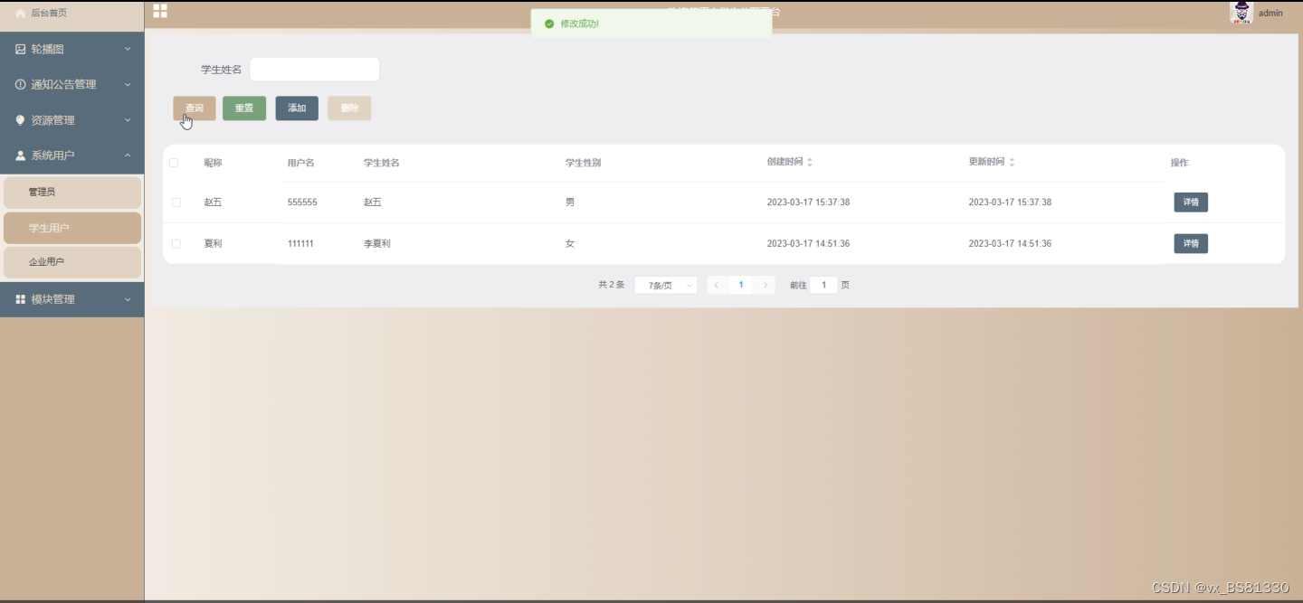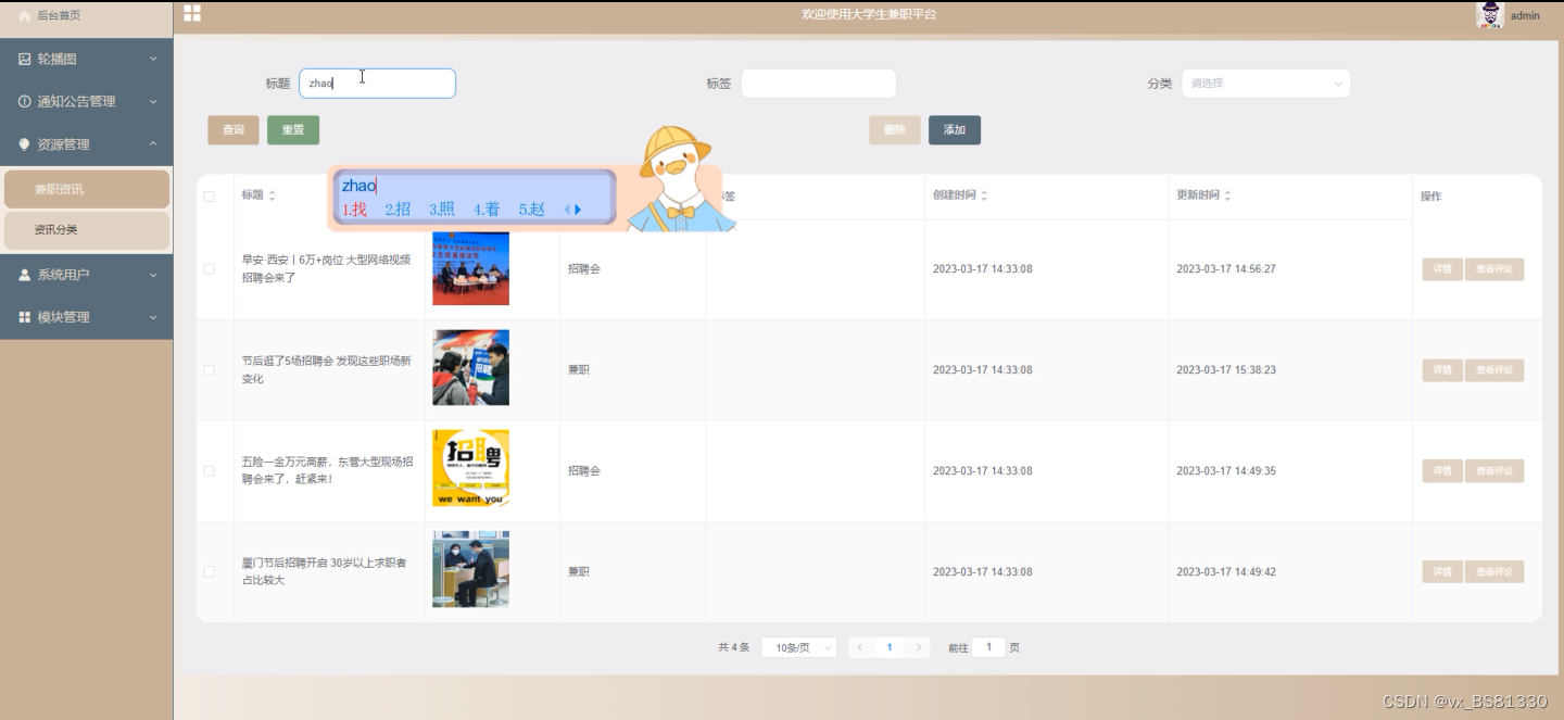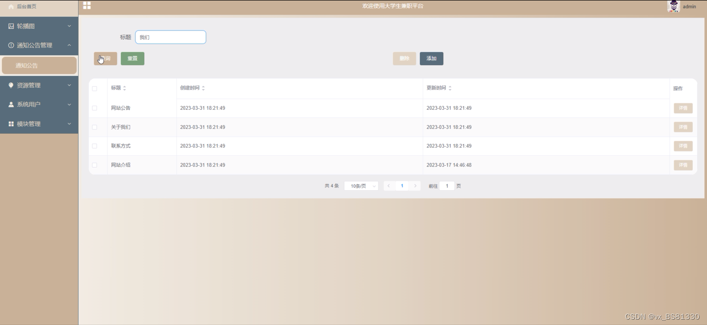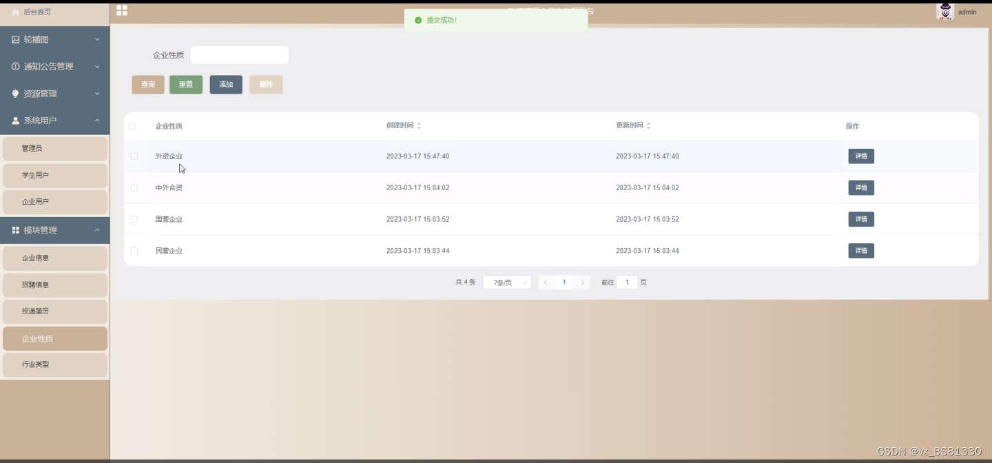 3、功能的完善性:拥有后台首页、个人中心、轮播图管理、通知公告管理、资源管理(兼职资讯、资讯分类)、系统用户(管理员、学生用户、企业用户)、模块管理(企业信息、招聘信息、企业性质、投递简历、行业类型)等功能的修改维护操作。