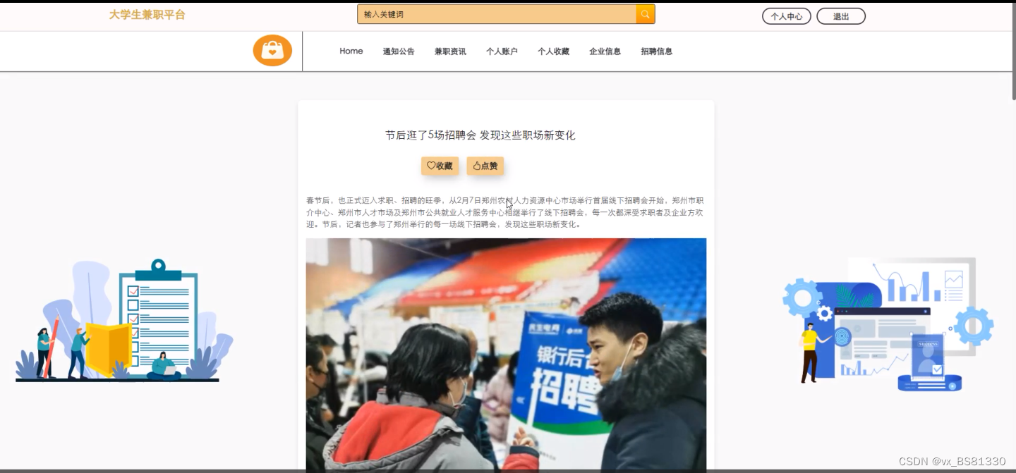 兼职资讯,在该页面可以通过局部搜索、筛选或排序进行查看管理员发布的兼职资讯信息,对自己喜欢的资讯可进行点赞、收藏、评论等操作,如图5-19 5-20所示。