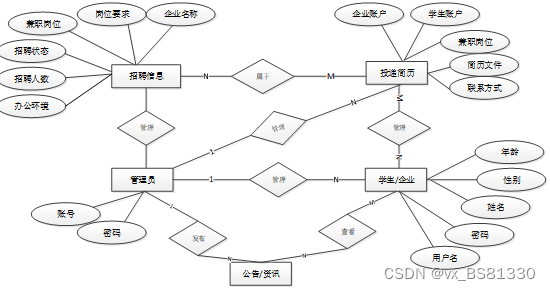 通过大学生兼职平台的功能进行规划分成几个实体信息,实体信息将通过ER图进行说明,本系统的主要实体图如下: