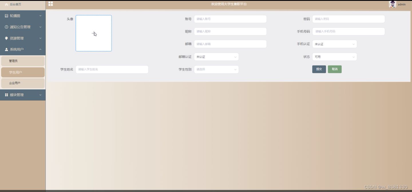 管理员进入系统后台可以查看:后台首页、个人中心、轮播图管理、通知公告管理、资源管理(兼职资讯、资讯分类)、系统用户(管理员、学生用户、企业用户)、模块管理(企业信息、招聘信息、投递简历、行业类型、企业性质)等功能模块。还可进行相应的操作,如图5-2所示。
