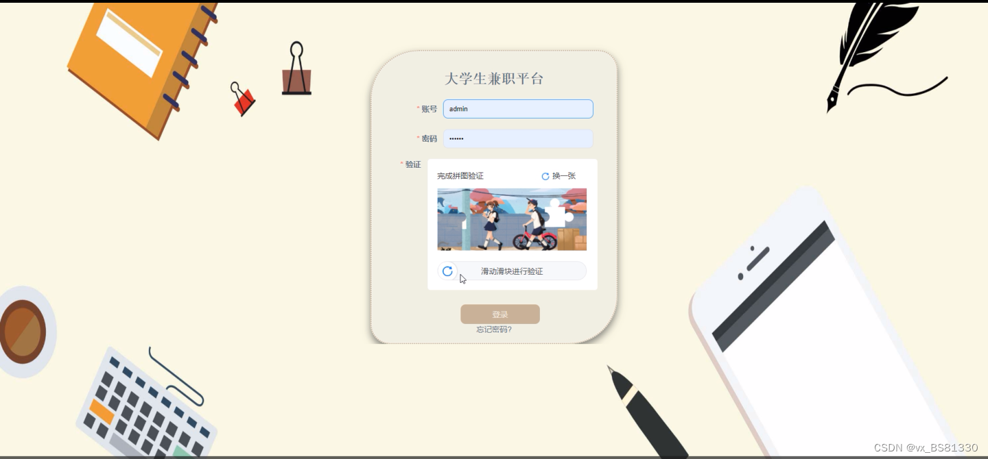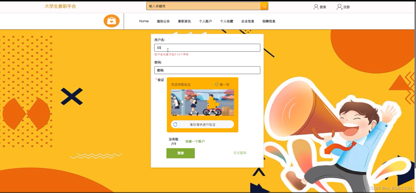 管理员登录大学生兼职平台,在登录页面输入用户名、密码、图片验证等进行登录,如图5-1所示。