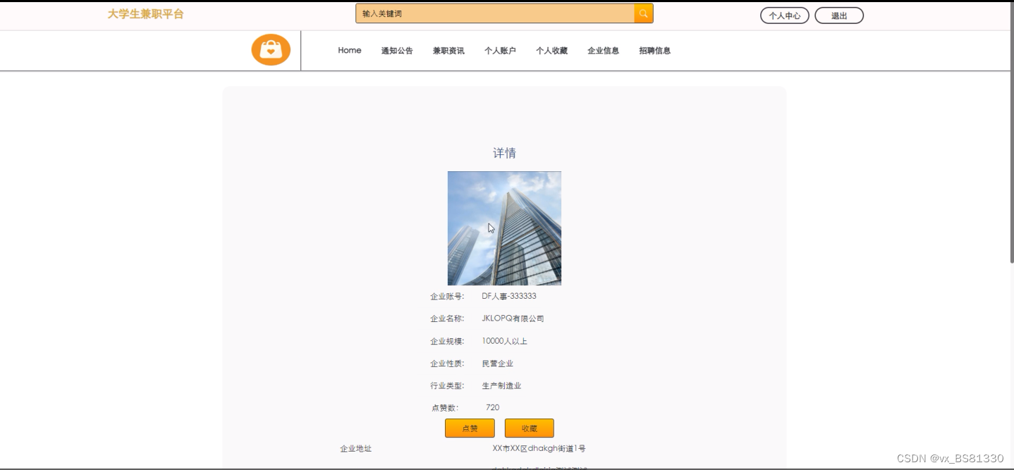 企业信息,在该页面可以通过搜索关键字或排序进行查看各个企业的详细信息,如:企业账户、企业名称、企业规模、企业性质、行业类型、点赞数、企业地址、企业简介等信息,可进行点赞、收藏、发表评论等操作,如图5-17 5-18所示。