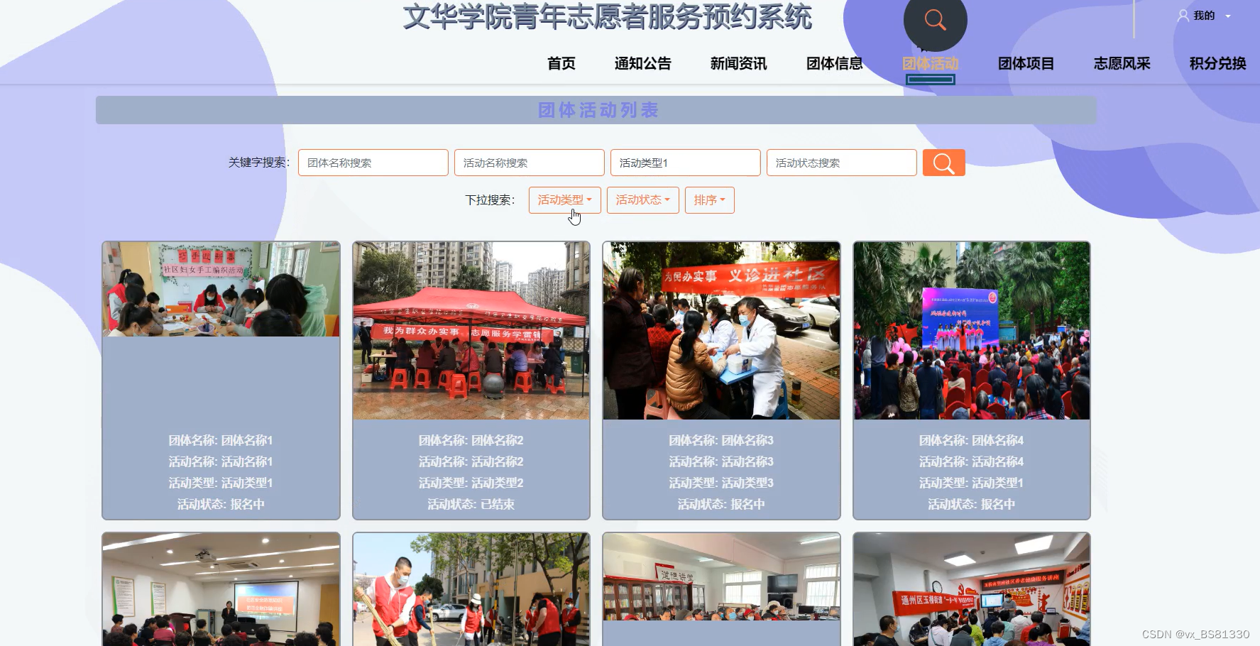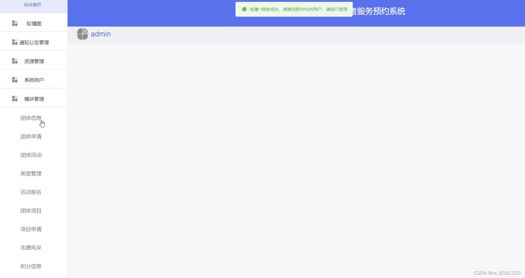 3、功能的完善性:管理员:后台首页、轮播图、通知公告管理、资源管理(新闻资讯、新闻分类)、系统用户(管理员、系统用户)、模块管理(团体信息、团体申请、团体活动、类型管理、活动报名、团体项目、项目申请、志愿风采、积分信息、积分兑换、兑换记录)模块的修改和维护操作。