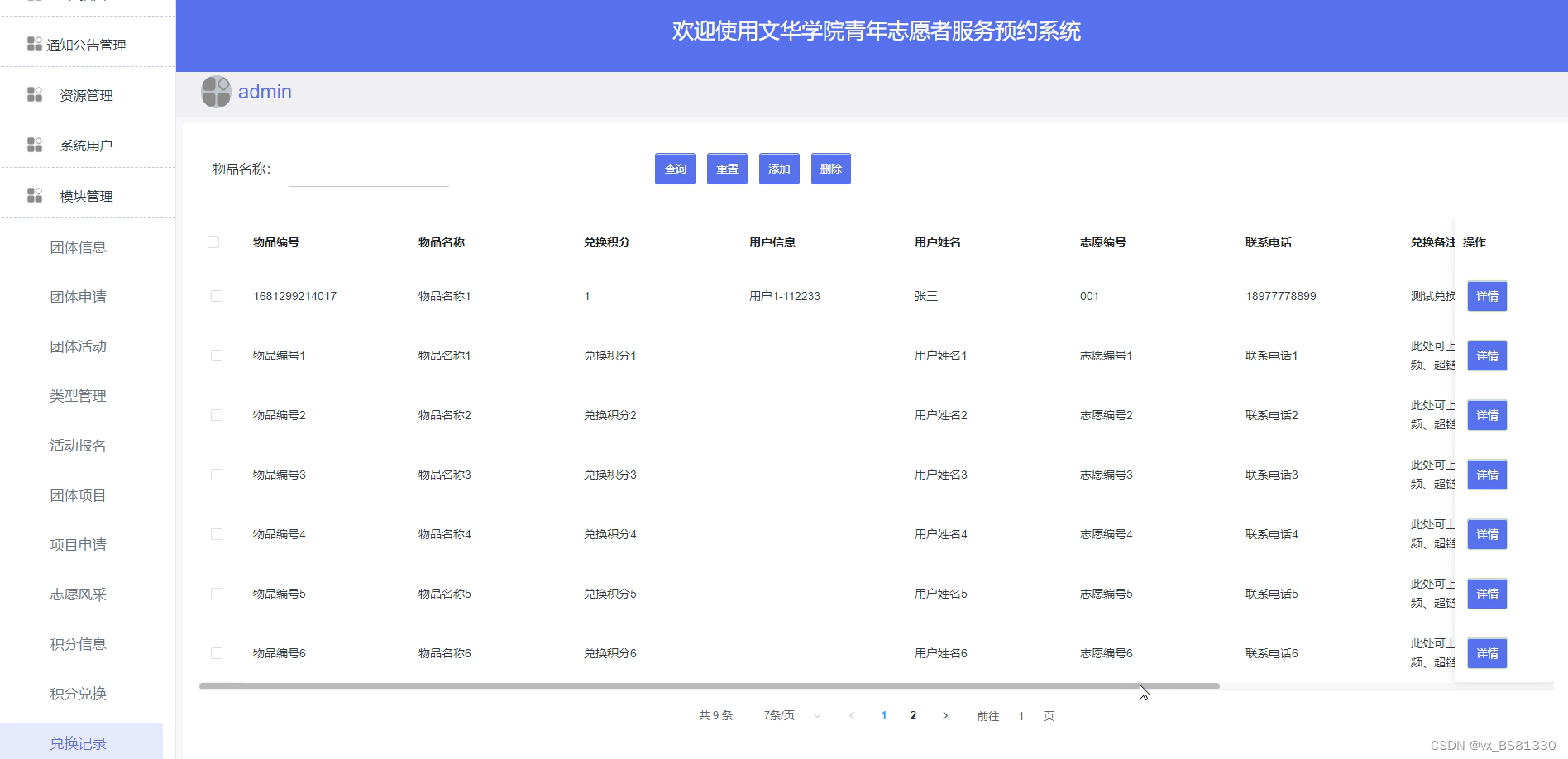 兑换记录,在兑换记录页面可以查看物品编号、物品名称、兑换积分、用户信息、用户姓名、志愿编号等信息进行查询、重置、添加、删除等操作,如图5-9所示。
