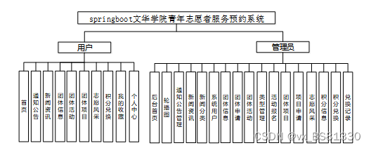 The Youth Volunteer Service Appointment System of Wenhua University mainly includes administrators: backend homepage, rotation chart, notification and announcement management, resource management (news information, news classification), system users (administrators, system users) Module management (group information, group applications, group activities, type management, activity registration, group projects, project applications, volunteer style, point information, point redemption, and redemption records); Users: Home page, notification announcements, news, group information, group activities, group projects, volunteer style, point redemption, my (my account, my favorites, personal center) and other functions. The main purpose of administrators in the system is to store and manage various types of information safely and effectively. They can also manage, update, and maintain the system, and have corresponding operation permissions for the backend.