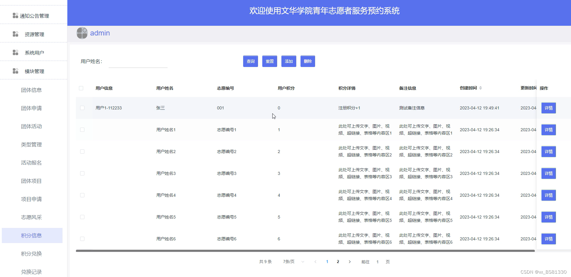 积分信息,在积分信息页面可以查看用户信息、用户姓名、志愿编号、用户积分等信息进行查询、重置、添加、删除等操作,如图5-8所示。