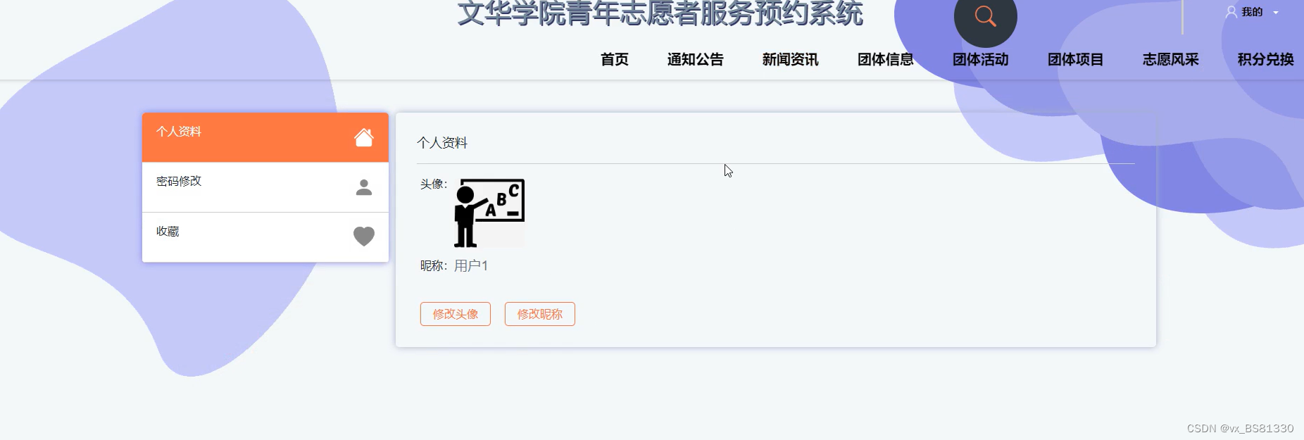 用户登录进入文华学院青年志愿者服务预约系统可以查看通知公告、新闻资讯、团体信息、团体活动、团体项目、志愿风采、积分兑换、我的(我的账户、我的收藏、个人中心)等内容,如图5-11所示。