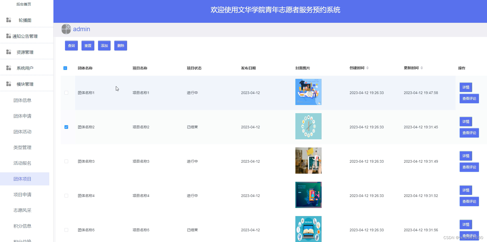 团体项目,在团体项目页面可以查看团体名称、项目名称、项目状态、发布日期等信息进行查询、重置、添加、删除等操作,如图5-7所示。