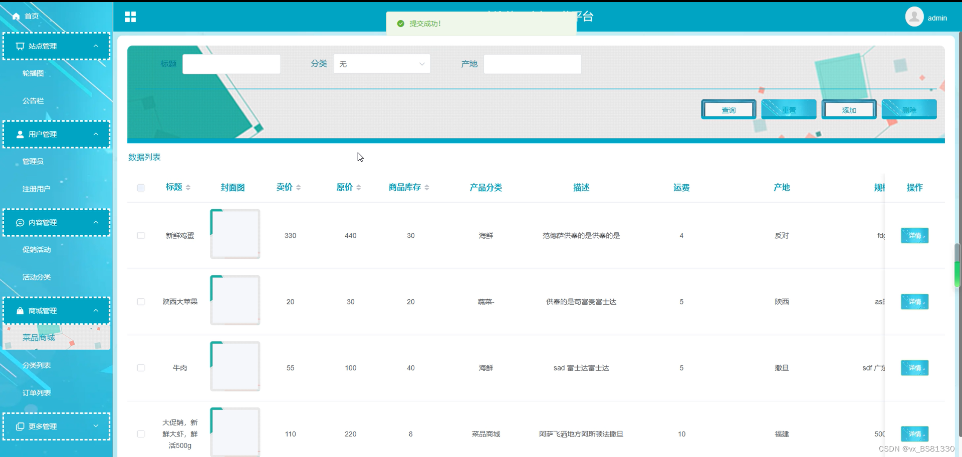 菜品商城,在菜品商城管理页面查看标题、封面图、卖价、原价、商品库存、产品分类、描述、运费、产地等信息,如图5-12所示。