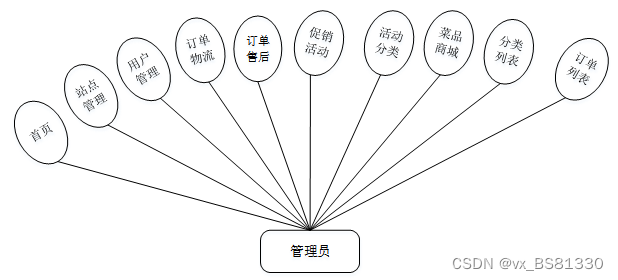 基于疫起买菜平台小程序的设计基于现有的手机,可以实现管理员首页、站点管理(轮播图、公告栏)用户管理(管理员、注册用户)内容管理(促销活动、活动分类)商城管理(菜品商城、分类列表、订单列表)更多管理(订单物流、订单售后)等详细的了解及统计分析。根据系统功能需求建立的模块关系图如下图: