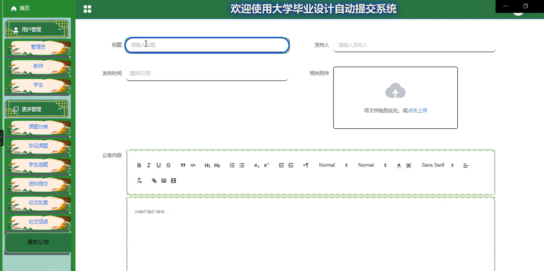 对于毕业设计自动提交系统所牵扯的管理及数据保存都是非常多的,例如系统首页、用户管理(管理员、教师、学生)更多管理(毕设课题、学生选题、资料提交、论文批复、论文成绩、通知公告)系统管理等,这给管理者的工作带来了巨大的挑战,面对大量的信息,传统的管理系统,都是通过笔记的方式进行详细信息的统计,后来出现电脑,通过电脑输入软件将纸质的信息统计到电脑上,这种方式比较传统,而且想要统计数据信息比较麻烦,还受时间和空间的影响,所以为此开发了毕业设计自动提交系统;为学生提供了方便管理平台,方便管理员查看及维护,并且可以通过需求进行设备信息内容的编辑及维护等;对于学生而言,可以随时进行管理,管理员和用户可以足不出户就可以获取到系统的数据信息等,而且还能节省用户很多时间,所以开发毕业设计自动提交系统给管理者带来了很大的方便,同时也方便管理员对用户信息进行处理。
