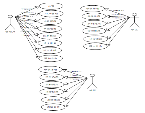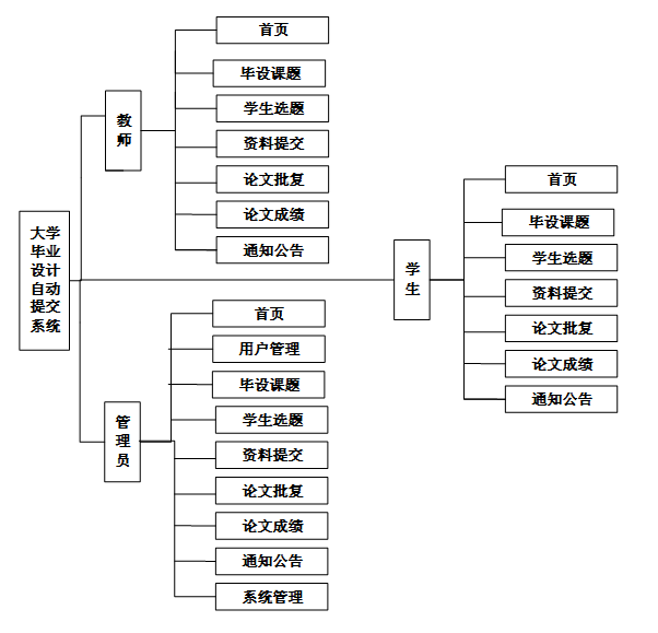 毕业设计自动提交系统的功能主要分为前台用户根据自己的需求进行注册登录,浏览职位信息并对选中的职位进行申请操作。后台系统管理员因职责的不同,分为普通管理员和超级管理员,普通管理员主要对申请单进行处理,而超级管理员主要对注册用户,毕设课题、学生选题、资料提交、论文批复、论文成绩、通知公告列表、学生选题分析进行处理。
