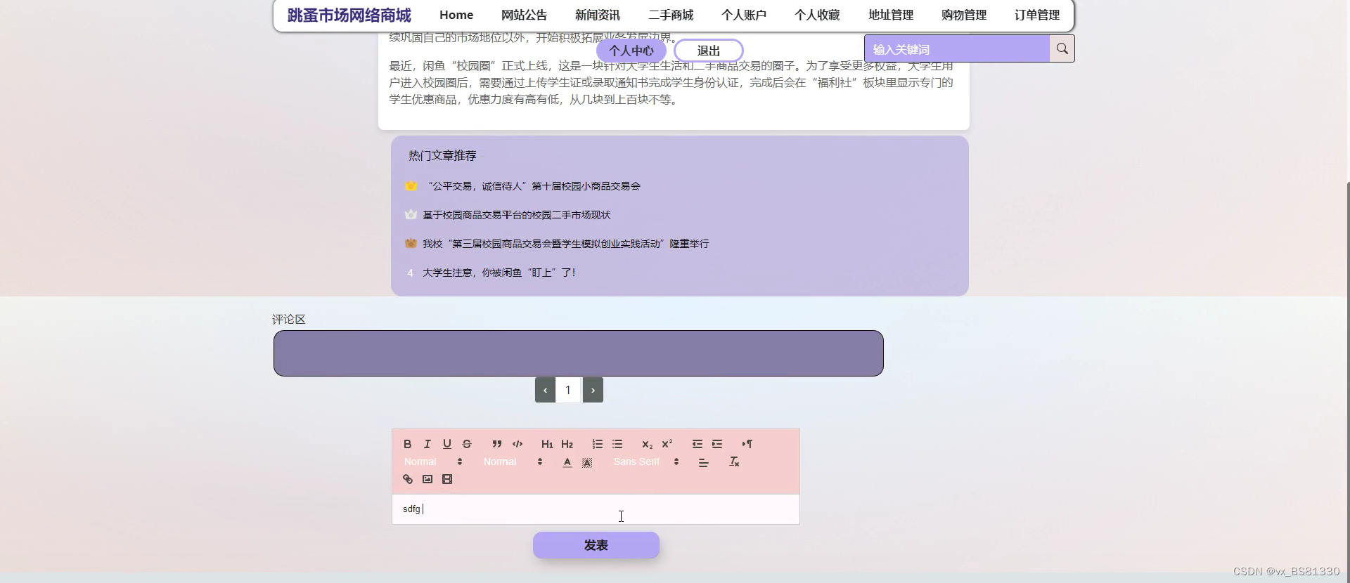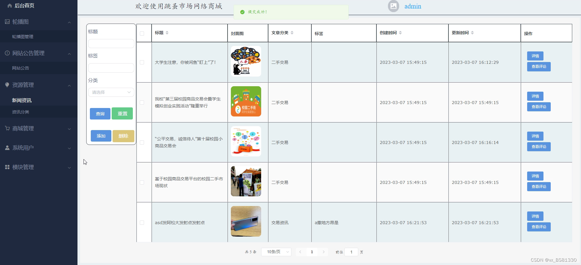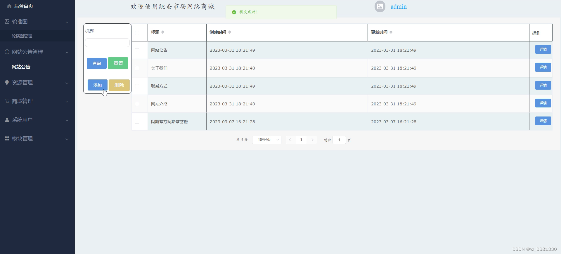 (1)网站公告管理:管理员可以对跳蚤市场网络商城中首页显示的轮播图以及系统中的一些公告发布到系统当中,让用户及时的查看到系统信息,进行合理安排。