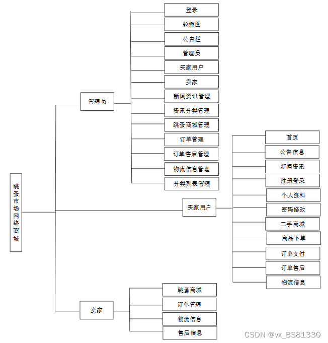 按照跳蚤市场网络商城的角色,我划分为了买家用户管理模块、卖家管理模块和管理员管理模块这三大部分。
