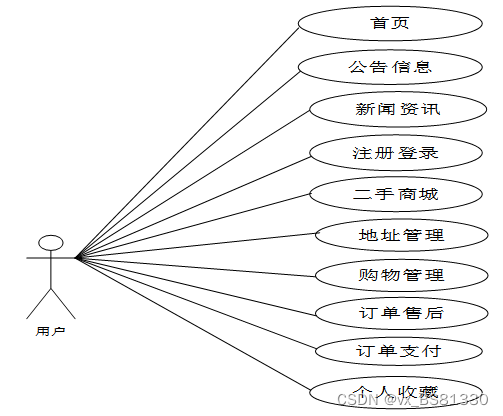 通过2.3功能的分析,得出了本跳蚤市场网络商城的用例图: