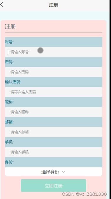 在注册页面可以填写用户名、密码、姓名、性别、头像、手机、邮箱等信息,进行注册如图5.8所示。