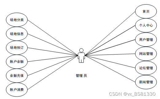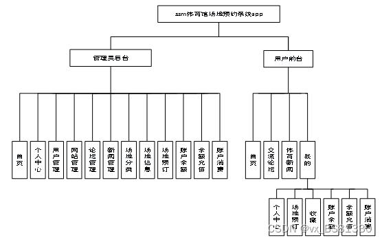 管理员后台;首页、网站管理(轮播图、公告通知)人员管理(管理员、注册用户)内容管理(交流论坛、论坛分类、体育新闻、新闻分类)模块管理(场地分类、场地信息、场地预订、账户余额、余额充值、账户消费)个人管理,用户前台;首页、交流论坛、体育新闻、我的(个人中心、收藏)场地预订、账户余额、余额充值、账户消费等。