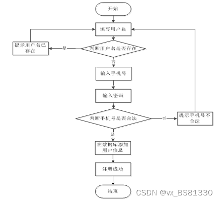未注册用户可进入注册界面,填写用户信息,若用户名存在的话,提示返回填写用户名,用户名不存在,则填写密码和手机号,如果电话号码是有效的,用户信息被添加到数据库,注册成功。用户注册流程图如图3.2所示。