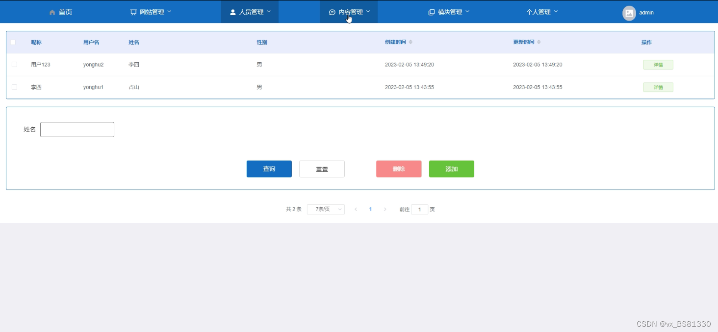 用户管理:通过内容列表可以获取用户编号、用户姓名、性别、联系方式、头像等信息,进行查看详情、修改、删除操作,如图5-3所示;