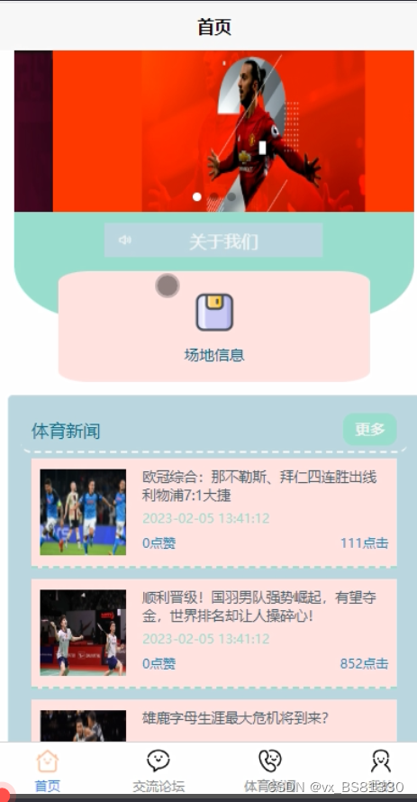 用户登录到首页可以查看首页、交流论坛、体育新闻、我的(个人中心、收藏)场地预订、账户余额、余额充值、账户消费等内容,如图5.10所示。