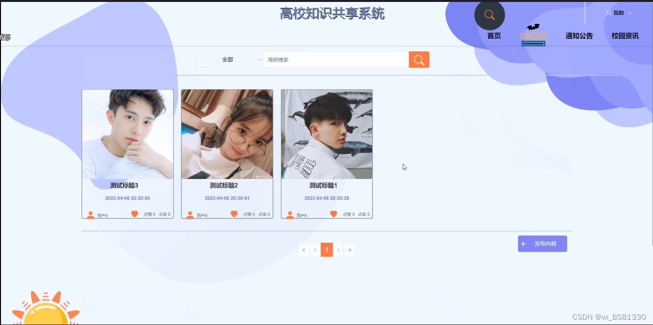 | 主事件流 | (1)系统检查是否是师生用户类型 用户输入标题、描述、类型、图片url和内容,开始执行发布用例 (3)发布成功,进入系统的主页 |