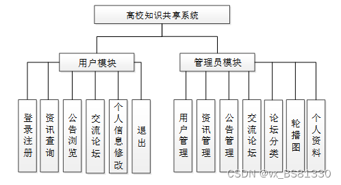 (3)确定好系统使用的技术,进行在线确认系统所划分的用户触,并且根据用户触划分确定所要设计的功能模块,对高校知识共享系统的设计主要划分别为管理员和用户触,并所使用的功能模块也相应不同,但系统的数据库实现的内容是交互的,驴可以随时根据自己的需求进行信息搜索,对于系统工作人员可以根据自己的分管内容进行在线信息的处理及操作,管理员获取到所有用户的详细数据信息,并根据需求进行第一时间处理解决。
