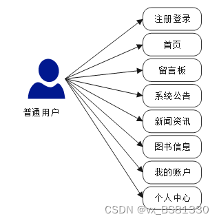用户模块:首页、留言板、系统公告、新闻资讯、图书信息、我的账户、我的收藏、个人中心等。