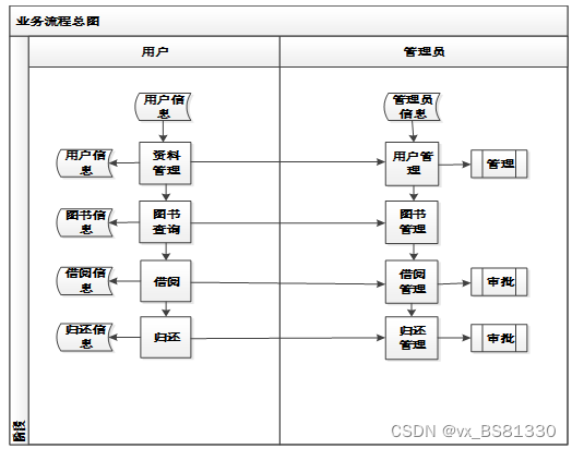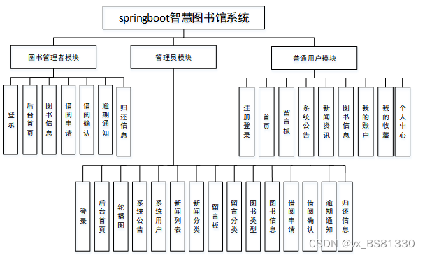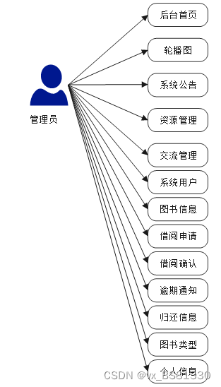 管理员模块:后台首页、轮播图、系统公告管理、资源管理(新闻列表、新闻分类)、交流管理(留言板、留言分类)、系统用户管理(管理员、图书管理者、普通用户)、模块管理(图书类型、图书信息、借阅申请、借阅确认、逾期通知、归还信息)。