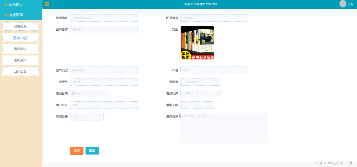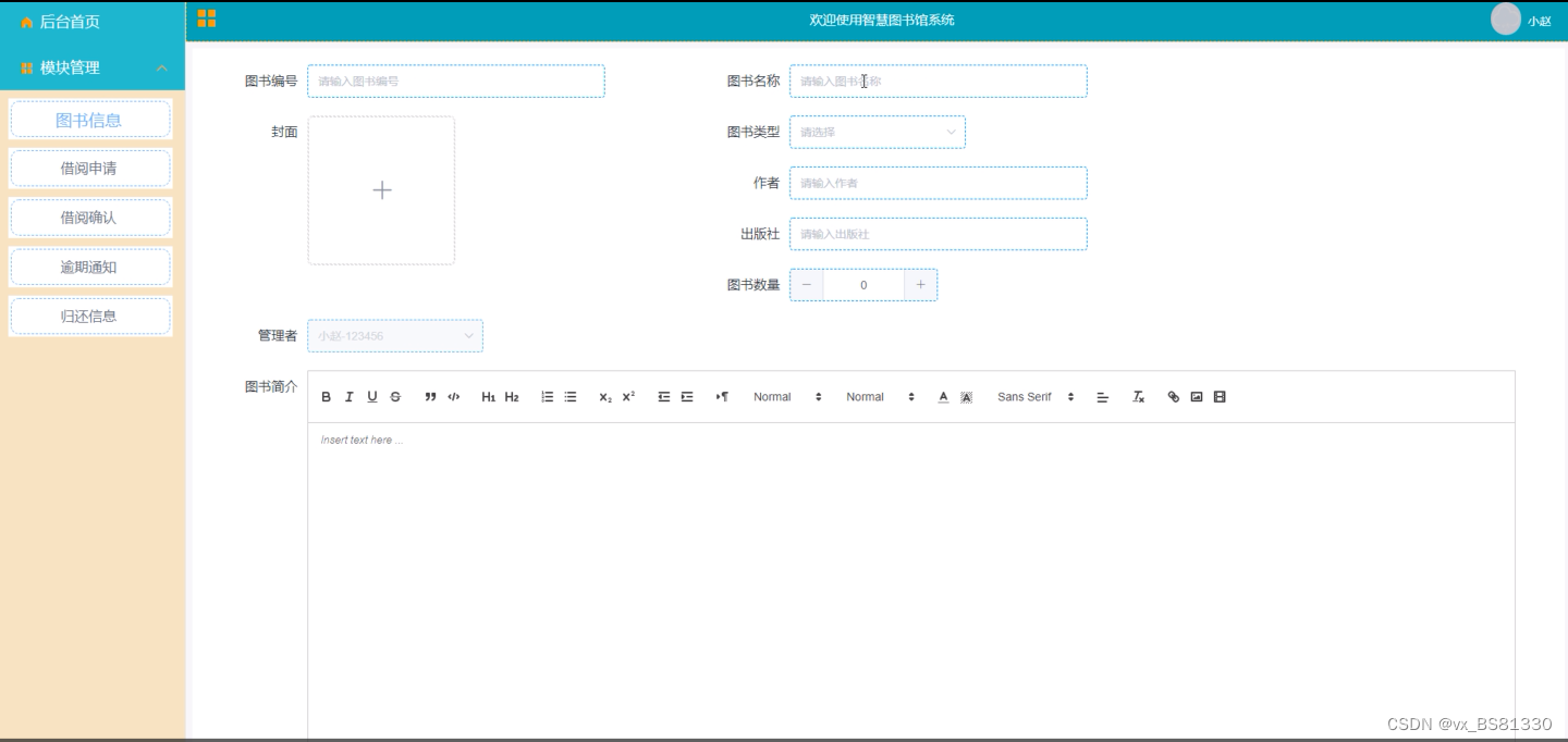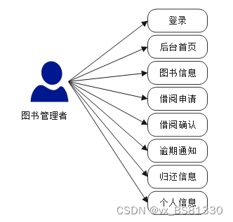 图书管理者:后台首页、模块管理(图书信息、借阅申请、借阅确认、逾期通知、归还信息)