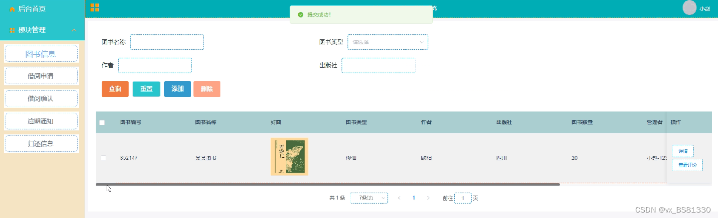 | 图书1 | A | 罗贯中 | 你好 | 添加成功 |