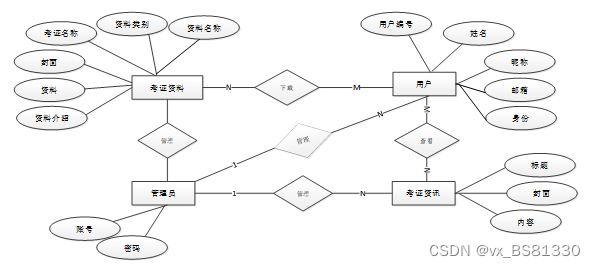 下面根据高校学生考证资源共享小程序的数据库总E-R关系图可以得出高校学生考证资源共享小程序需要很多E-R图,在此罗列出来一些主要的数据库E-R模型图。