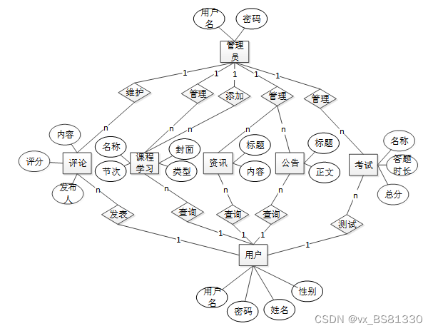 下面是整个英语自主学习平台中主要的数据库表总E-R实体关系图。