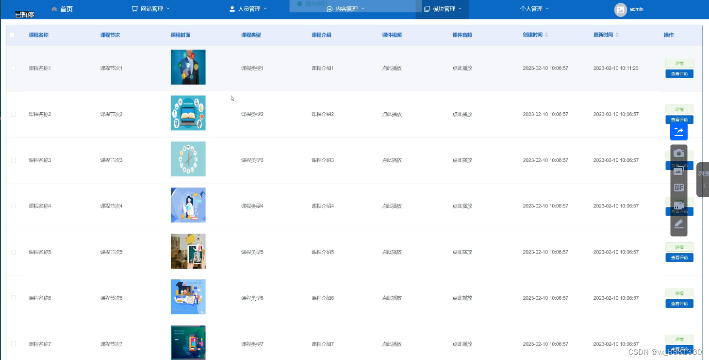 (4)模块管理:当点击“模块”这一菜单的时候,会出现课程类型+课程学习这两个子菜单,管理员能够对两个模块进行增删改查操作;