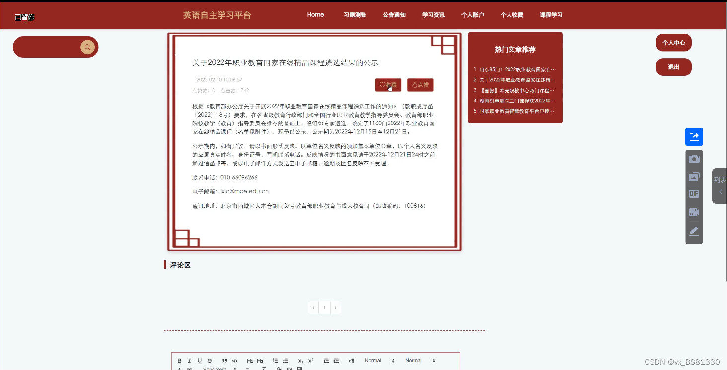(3)学习资讯:用户可以查看学习资讯信息,在查询到自己想要了解的学习资讯的时候,可以进入查看详细的介绍进行评论、点赞、收藏操作。
