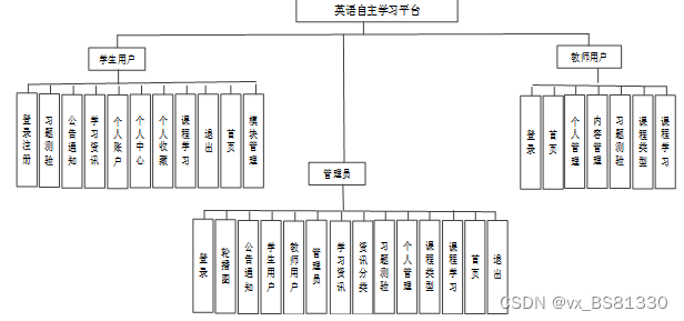 英语自主学习平台从角色上划分为了学生用户、教师用户以及管理员三种角色。