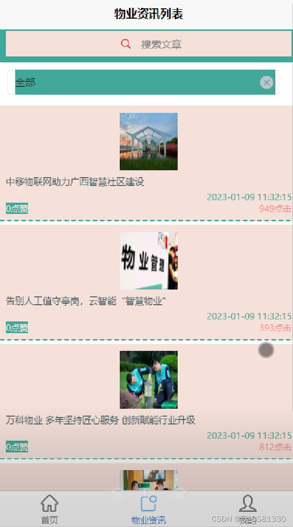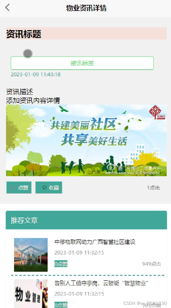 业主用户对物业资讯进行查看,搜索,点赞,收藏,评论等等操作,如下图所示。