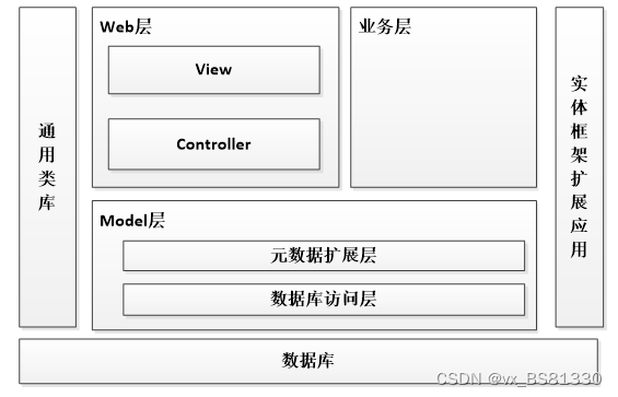 本物业管理系统的架构设计主要分为可以3层,主要有Web层,业务层,Model层。其中web层还包括View层和Controller层,Model层包括元数据扩展层和数据访问层。