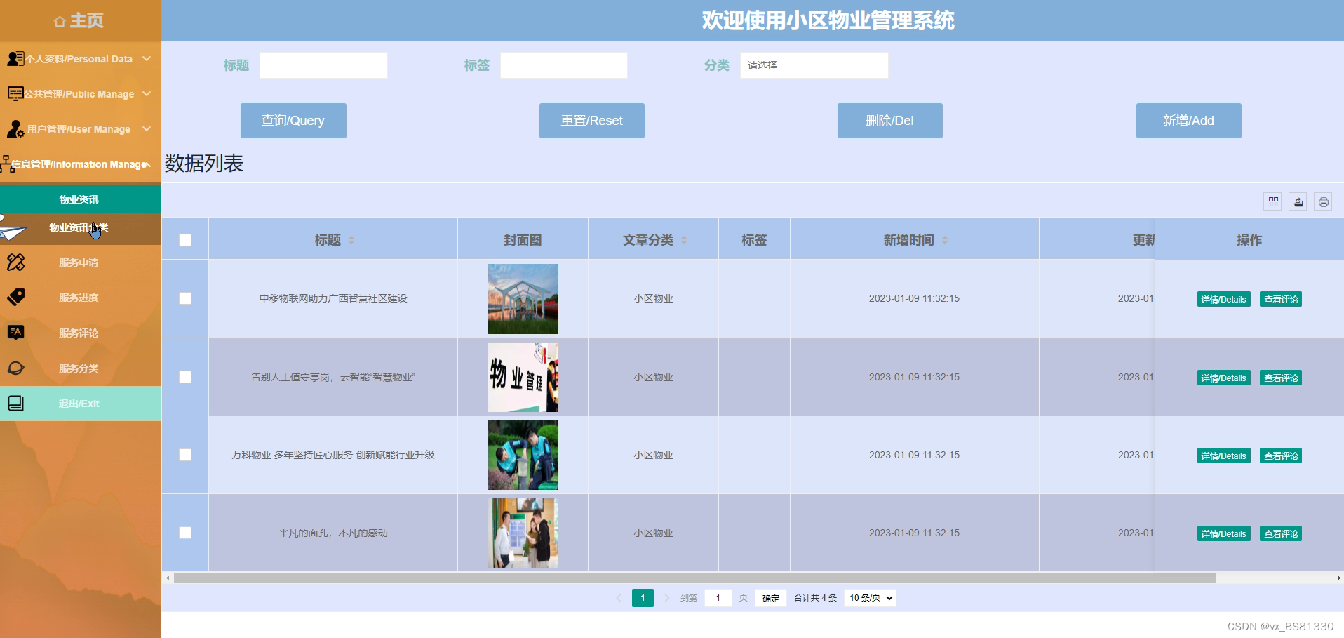 物业资讯:管理员对物业资讯进行重置,删除,添加等操作,如下图所示。