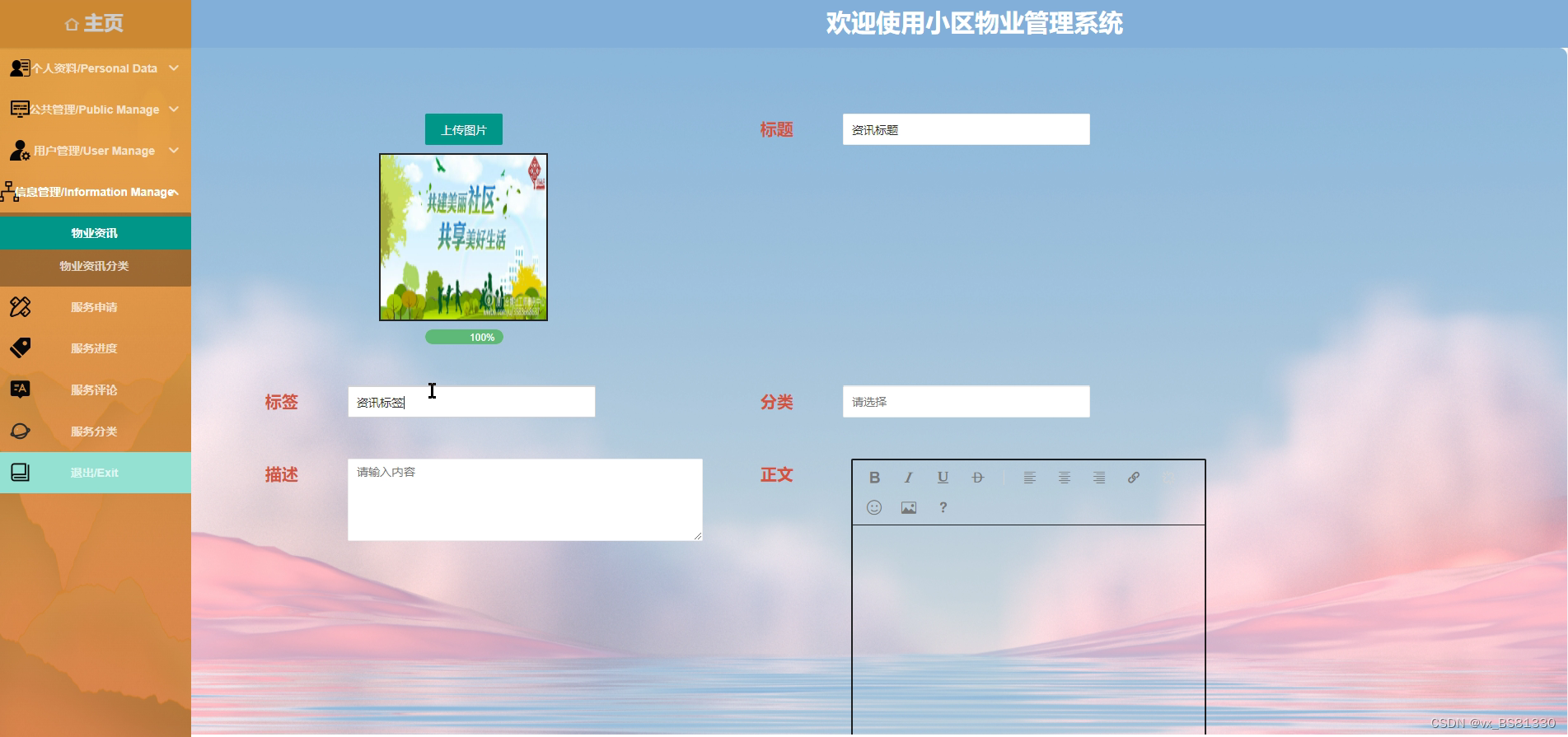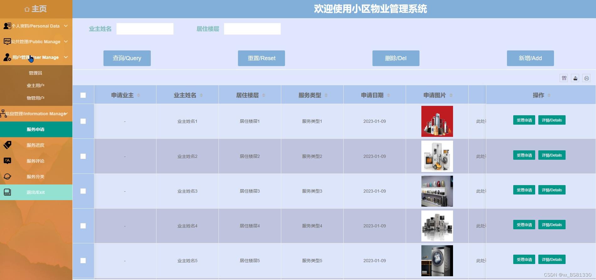 管理员用户管理模块:主页,个人资料(个人信息,密码修改),公共管理(轮播图,物业公告)用户管理(管理员,业主用户,物管用户),信息管理(物业资讯,物业资讯分类),服务申请,服务进度,服务评论,服务分类等。
