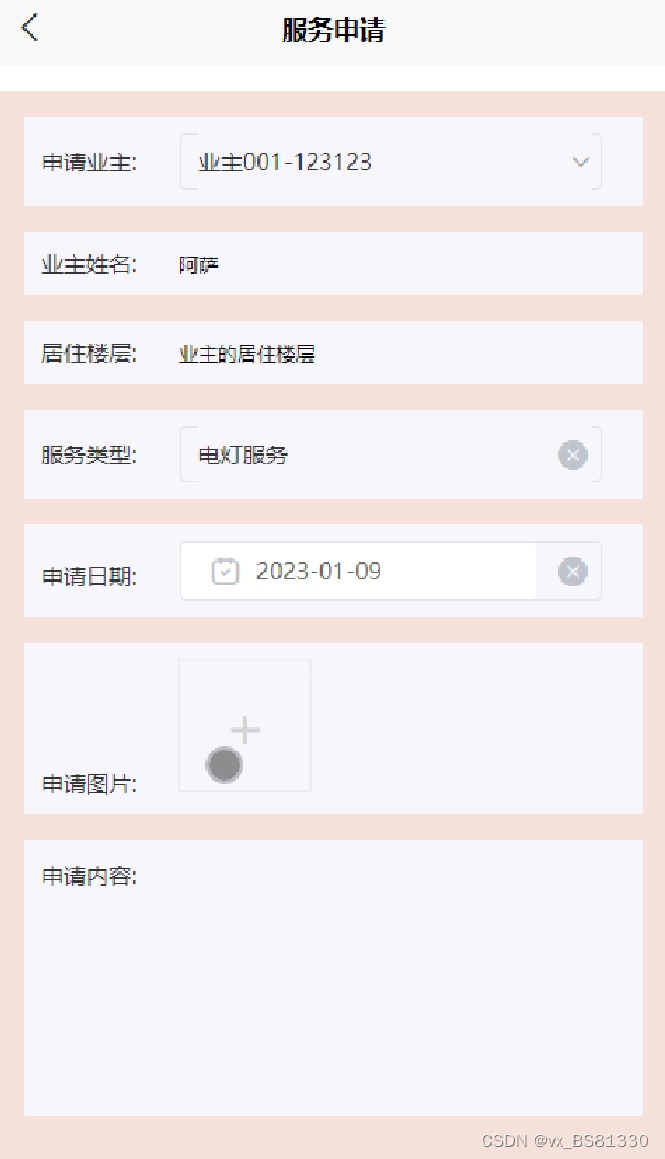 业主用户登录系统后可以申请各类物业服务,过程如下图所示。